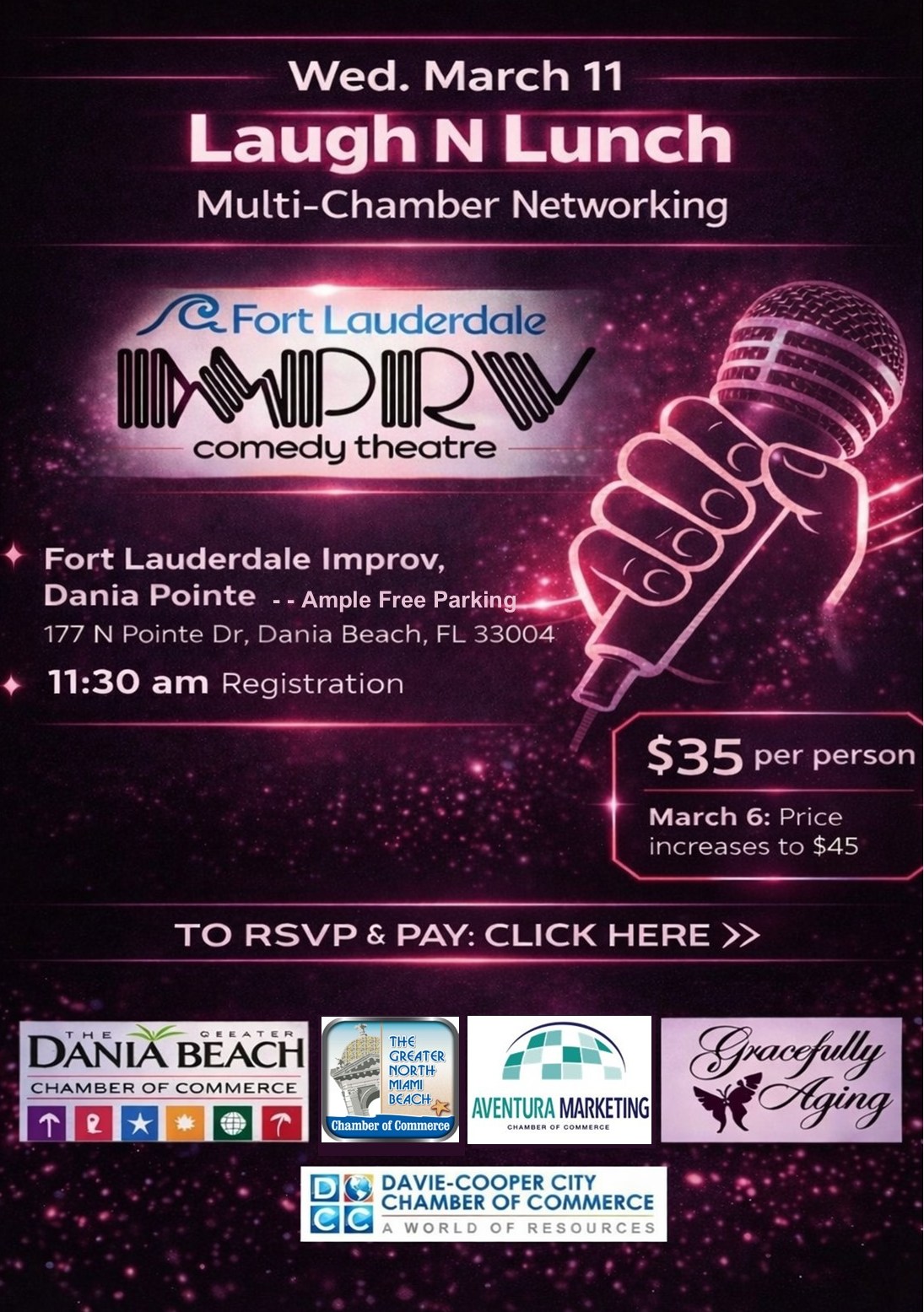 | 3/11/2026 | Wed. March 11 Laugh N Lunch Multi-Chamber Comedy @ Fort Lauderdale Improv, Dania Pointe Event Details Time: 11:30 AM – 2:00 PM Location: Fort Lauderdale Improv Comedy Club, Dania Pointe, 177 N Pointe Dr, Dania Beach, FL 33004 Buffet Lunch Includes: Caesar Salad, Entrées: Shrimp Scampi, Napa Chicken, Baked Ziti, Sides: Garlic Mashed Potatoes, Garlicky Green Beans, Dessert: Cookies & Brownies, Beverages: Water, Iced Tea, Soda, Hot Tea, Coffee Cost: $35 per person (includes buffet lunch, non-alcoholic drink, incredible networking, and a comedy show.) March 6, ticket price increases to $45 Pay Link: https://secure.usaepay.com/interface/epayform/qeXhgg9arJGHD0Srpjxxttcv4cacaJmO/ |